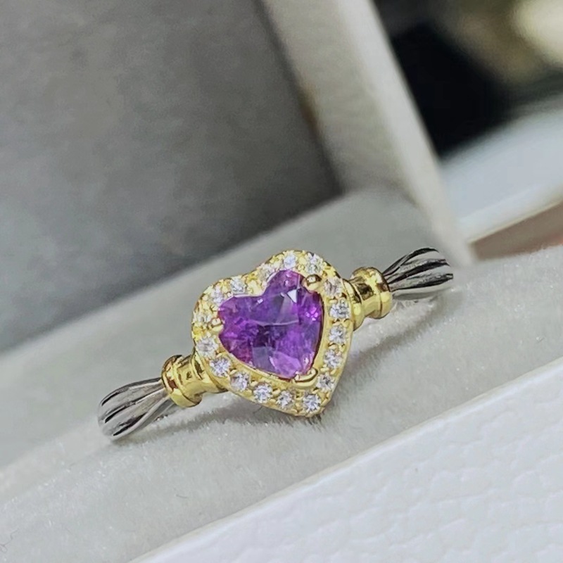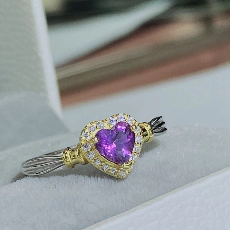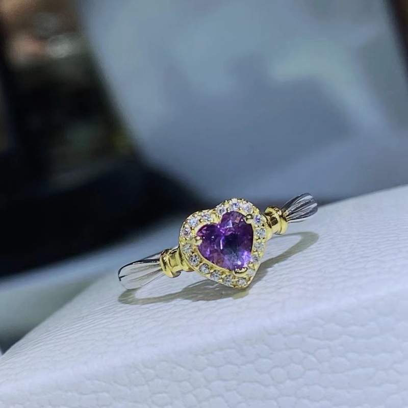 Adjustable natural amethyst ring, S925 sterling silver setting, simple heart-shaped women’s ring.